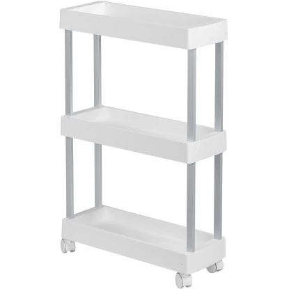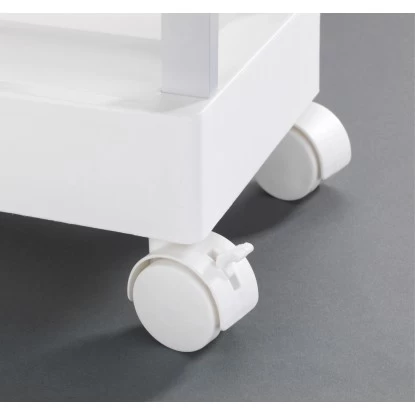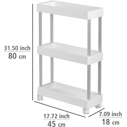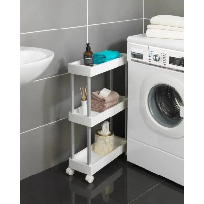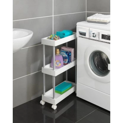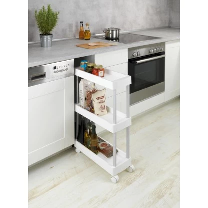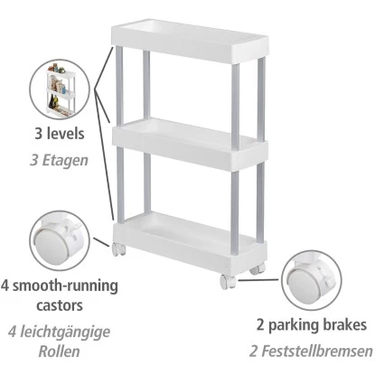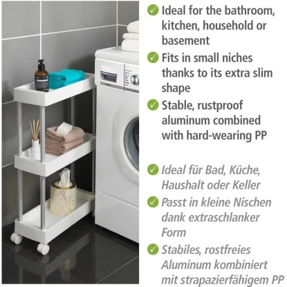 Lücken sinnvoll ausfüllen – Der praktische Wenko Haushalts- und Badwagen Mino Servierwagen Haushaltswagen mit 3 Ablagen bietet viele Funktionen für Küche und Haushalt. In der Küche können auf drei Etagen Lebensmittel und Utensilien übersichtlich aufbewahrt werden. Der Rollwagen passt genau unter die Küchenarbeitsplatte und kann durch die vier leichtgängigen Rollen bequem hervorgezogen werden. Zudem ist er jederzeit einfach und flexibel an unterschiedlichsten Stellen neu positionierbar. Die beiden Feststellbremsen sorgen für sicheren Halt. Durch die extraschlanke Form passt der Küchenwagen auch in kleine Lücken. In der Waschküche macht der Sammelwagen ebenfalls eine gute Figur. Auf den Ablageflächen können Waschmittel und Waschhelfer aufbewahrt werden und sind immer griffbereit. Das Allround-Talent gibt im Badezimmer Handtüchern, Pflegemitteln und Dekoration einen attraktiven Stellplatz. Da Wenko Qualität und Nachhaltigkeit am Herzen liegen, ist der Beistellwagen aus stabilem, rostfreiem Aluminum gefertigt, kombiniert mit strapazierfähigem PP. Die weißen Ablagen erzielen einen angesagten Kontrast zu dem silber-matten Gestell.