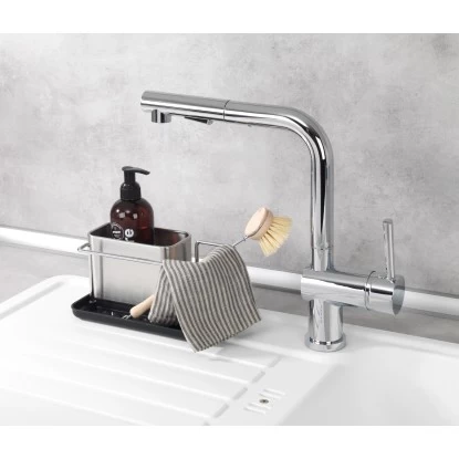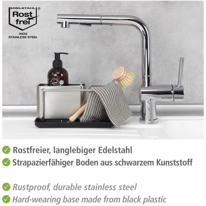 Design trifft Funktionalität mit dem praktischen WENKO Spülorganizer Orio aus Edelstahl. Der stilvolle Waschbecken-Caddy ist der ideale Platz zur dekorativen Aufbewahrung und Trocknung von Spülmittel, Schwamm, Spültuch und Spülbürste. Das Maß des anwendungsorientierten Spülorganizers beträgt (B x H x T): 13,5 cm x 10 cm x 7 cm, die Gesamtabmessung liegt bei (B x H x T): 21 cm x 10,5 cm x 12 cm. Durch die übersichtliche Aufteilung des Utensilienhalters erleichtern wir Ihnen das lästige Spülen.